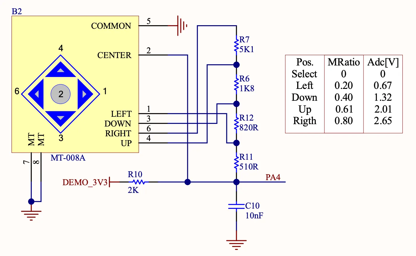 STM32C0316보드의 온보드 조이스틱은 전압 분배 저항을 통해 ADC에 연결되어 있습니다. 이를 이용하면 ADC와 연결된 하나의 핀 만으로 상, 하, 좌, 우, 클릭 네 가지 상태를 읽을 수 있습니다.