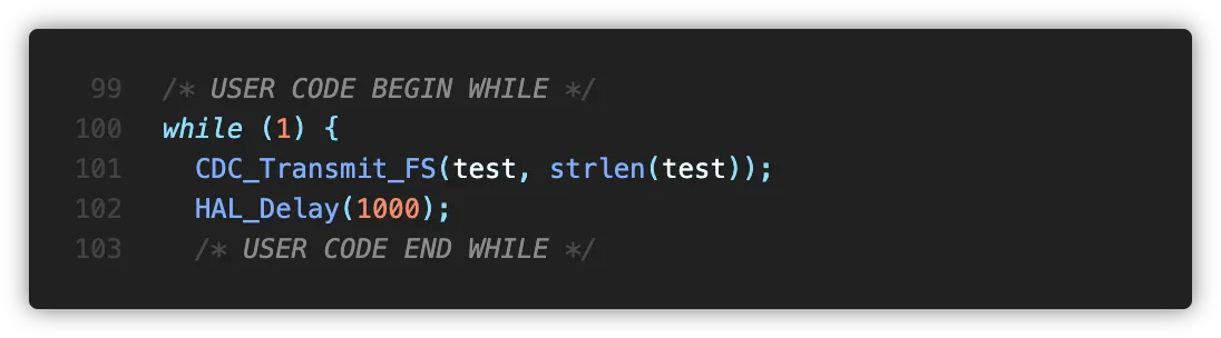 USB DEVICE 설정을 CDC로 선택하였습니다.