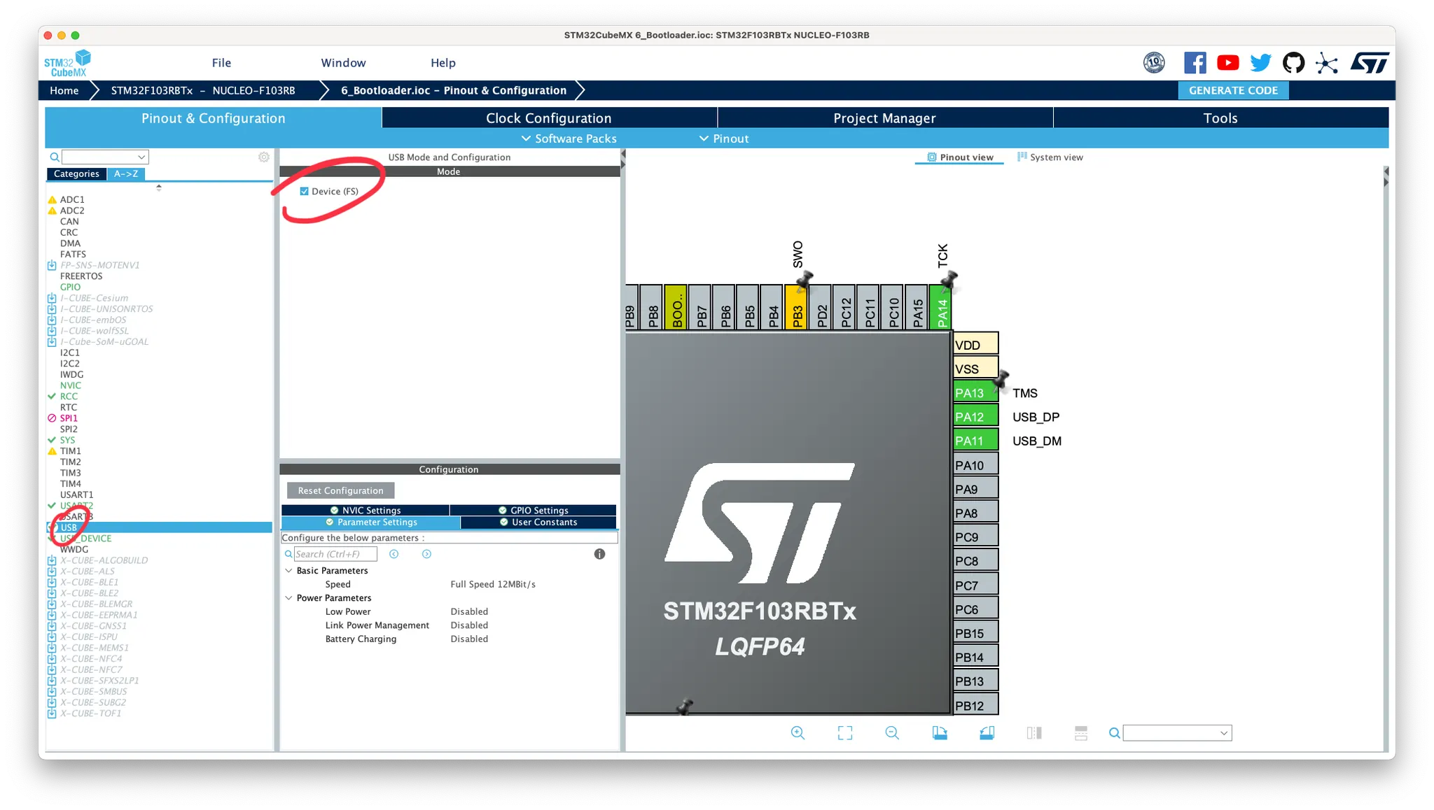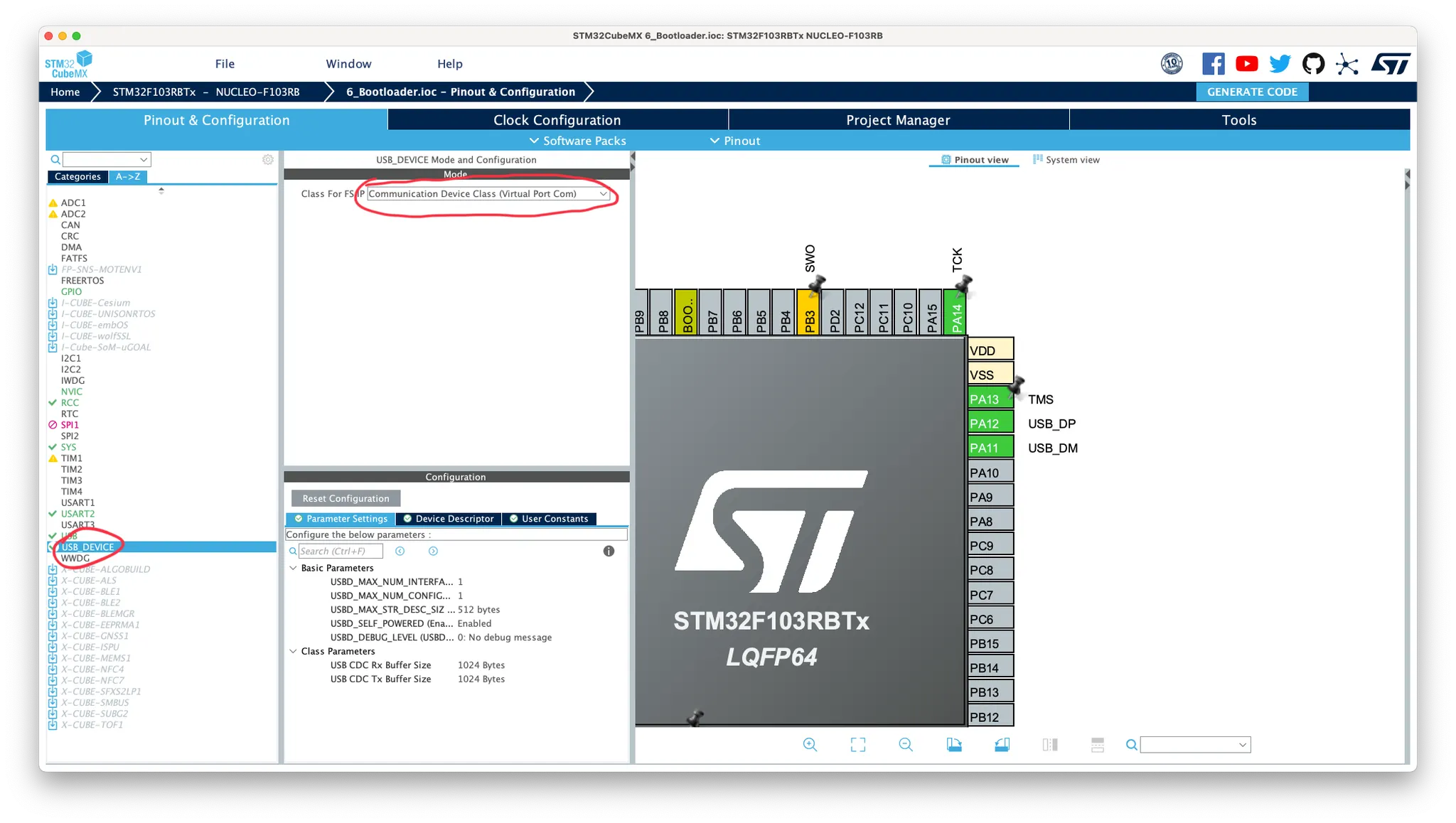 NUCLEO-F103RB 개발보드로 프리셋을 설정한 후 USB Device를 Enable,