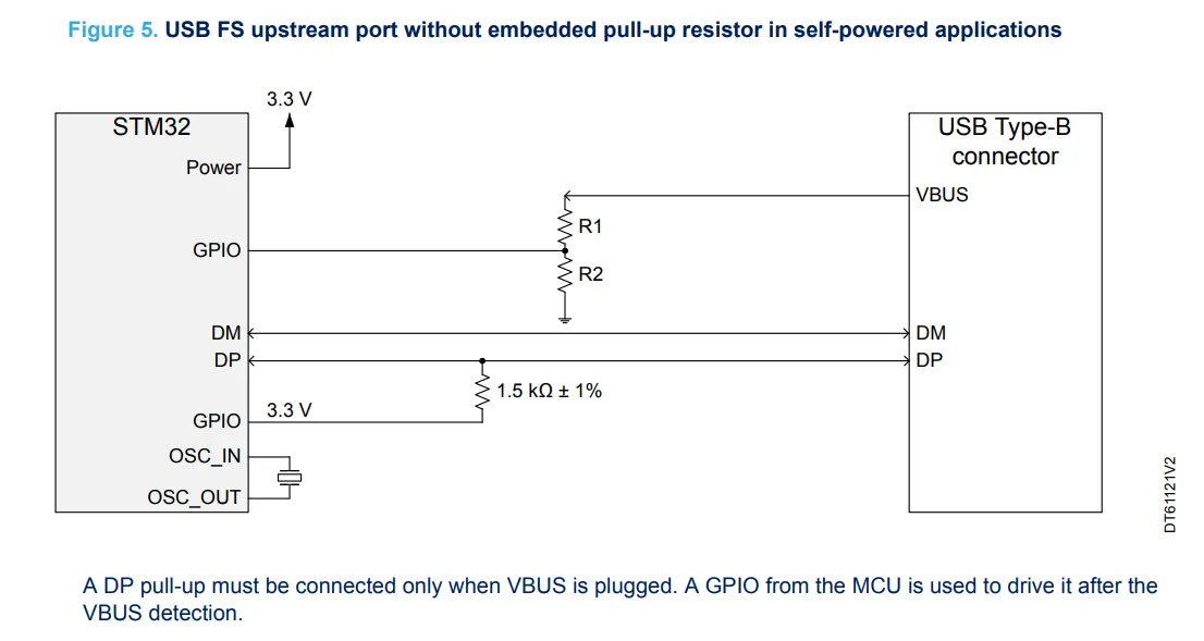 AN4879에서는 1.5 k 저항을 이용해 GPIO와 연결하라고 하네요. USB 스펙에 따라 USB의 연결 여부를 감지한 후에 DP 라인을 Pull-up하도록 하는 것 같습니다.