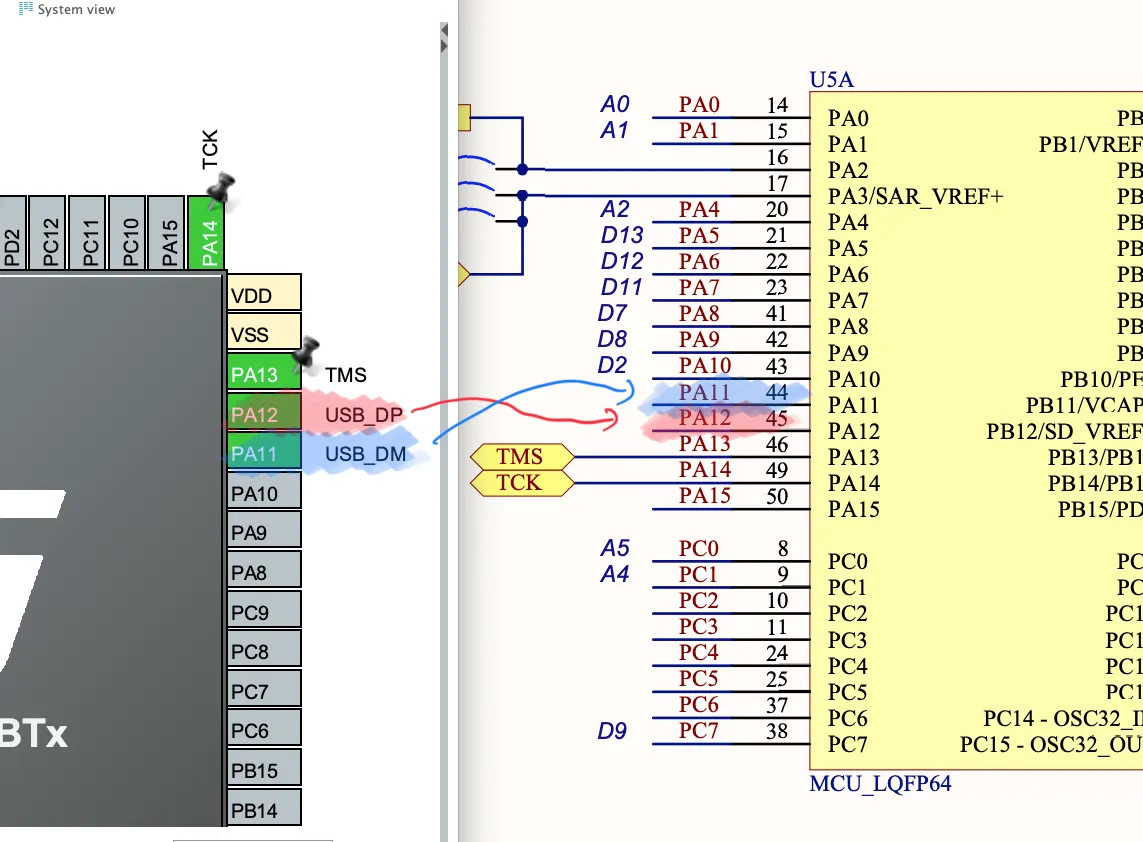 Nucleo-64의 Schematic을 참고해 보면 USB의 두 디퍼런셜에 해당하는 PA11과 PA12에 아무런 핀이 연결되어 있지 않은 것을 확인할 수 있습니다.