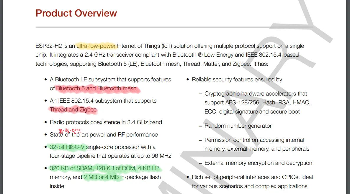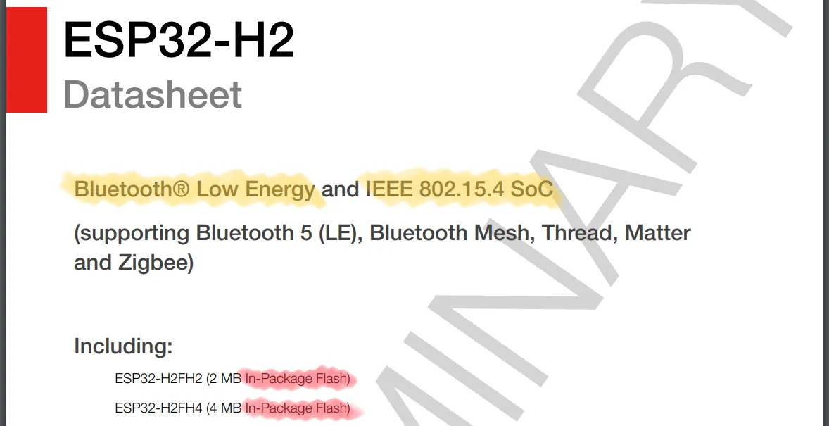 표지에는 굵직굵직한 내용만 있네요. BLE와 IEEE802.15.4를 지원하는 MCU라 합니다. 그런데.. 모델 구분에 In-Package Flash….? 세상에.. 이미 ESP32-H2-MINI 모듈 자체도 작기 때문에 SoC를 직접 사용할 일은 적어보이지만 굳이 설계할 일이 있다면 편리할 것 같습니다.