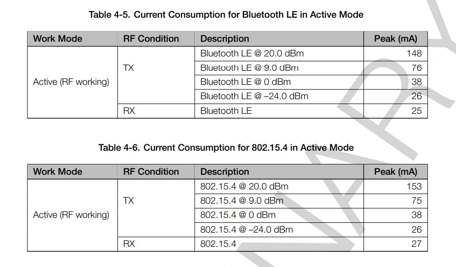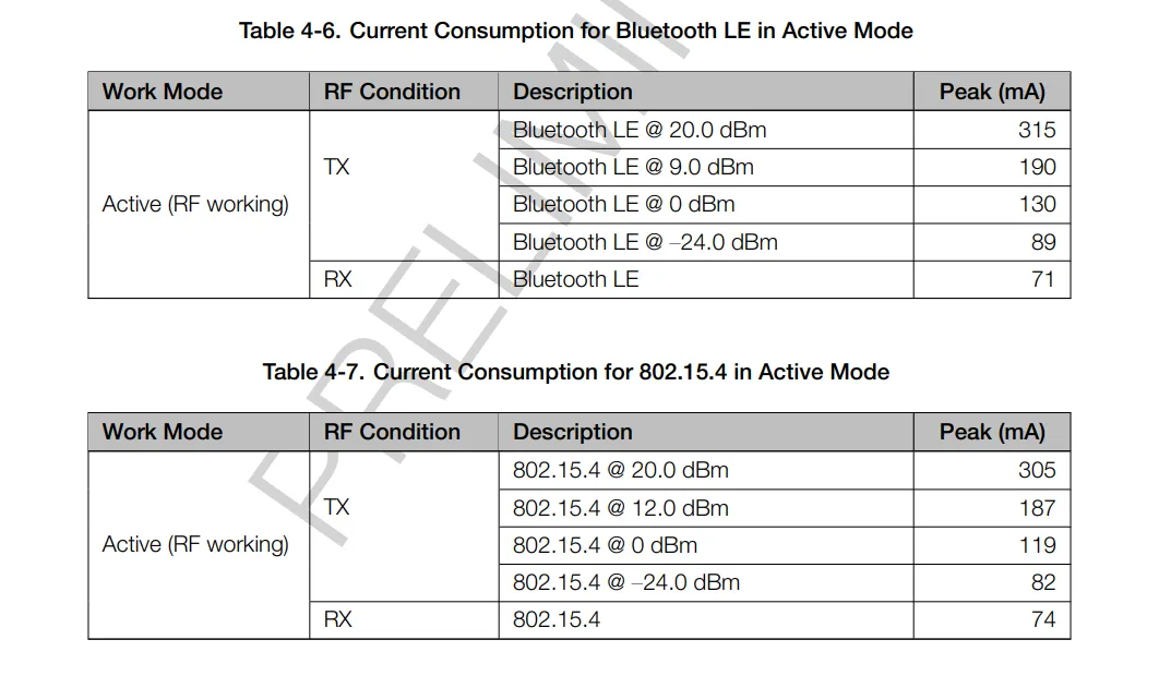 초-저전력이라는 문구가 있어 동일하게 ZigBee와 BLE를 지원하는 ESP32-C6과 전류 소비를 비교해보았습니다. RF 동작 시에는 2배, 절전 상태에서는 대략 3배까지 소비 전류가 낮습니다.