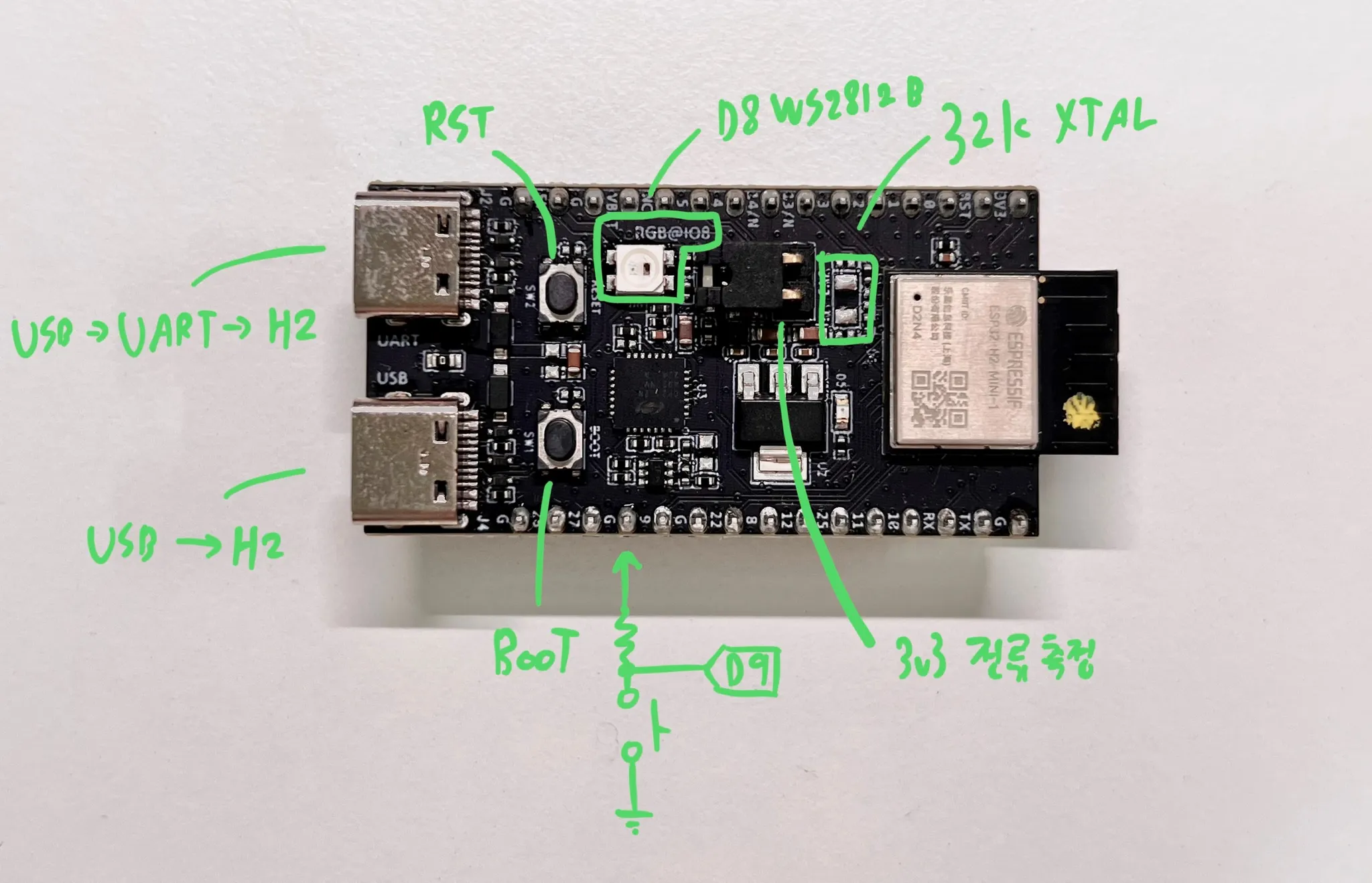 리셋 버튼과 부팅 모드 선택을 위한 버튼입니다. 특이하게도 H2는 기존 ESP32와 다르게 9번 GPIO가 부팅 모드 선택으로 묶여있었습니다.