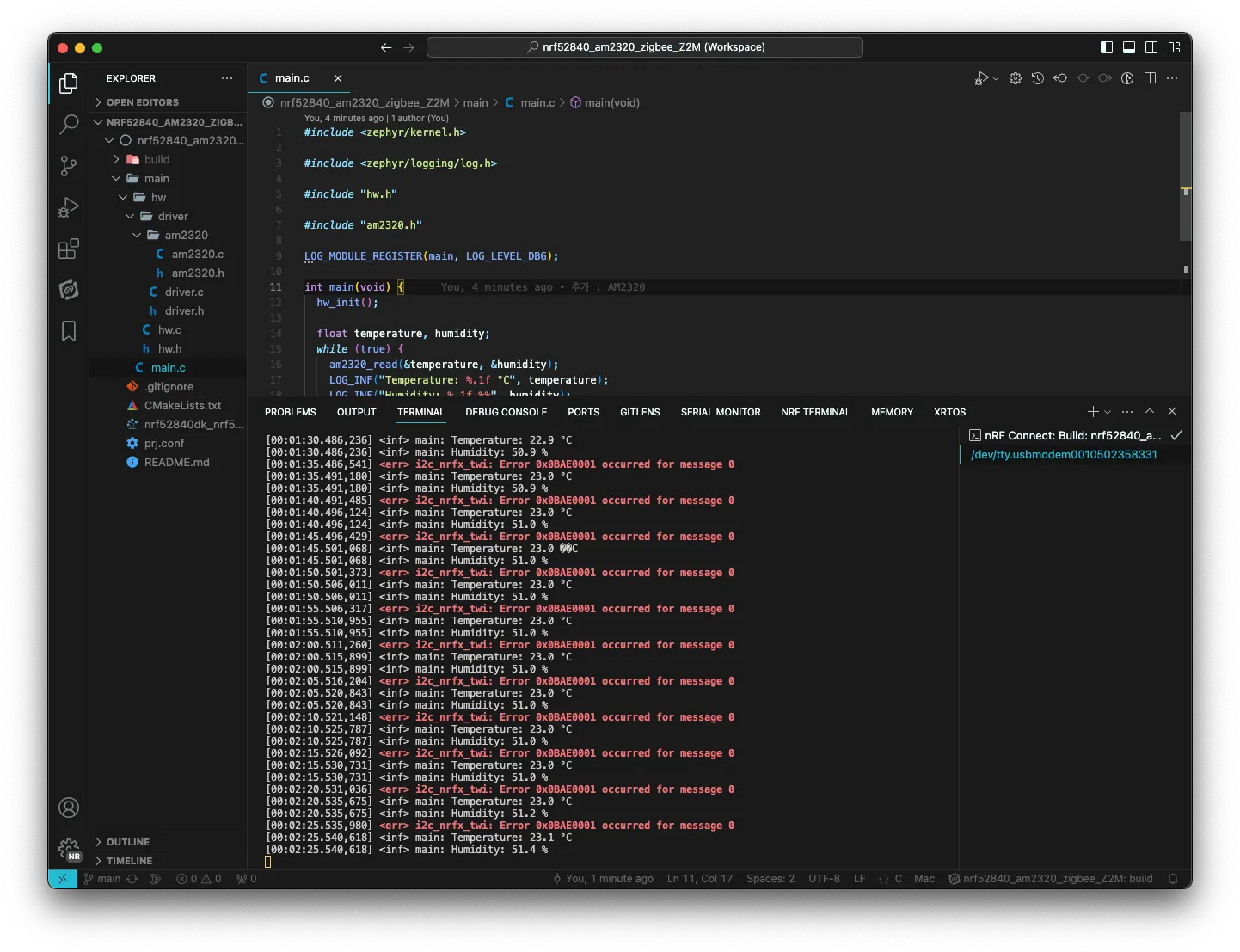 이번 포스팅에서는 SDK의 I2C 드라이버를 이용해 I2C 온습도 센서인 AM2320을 사용해 보았습니다.