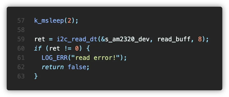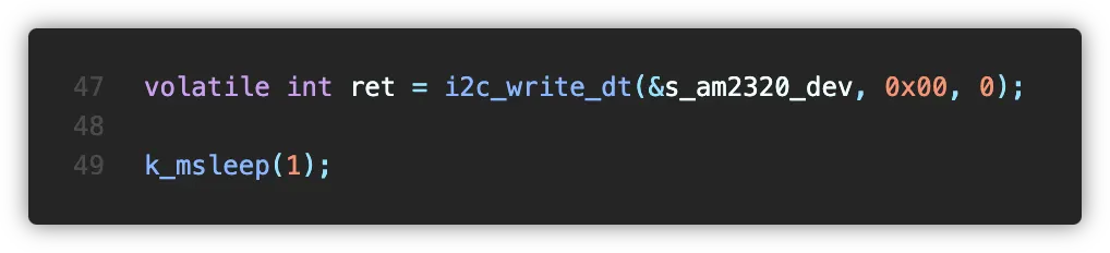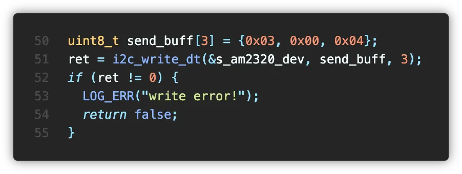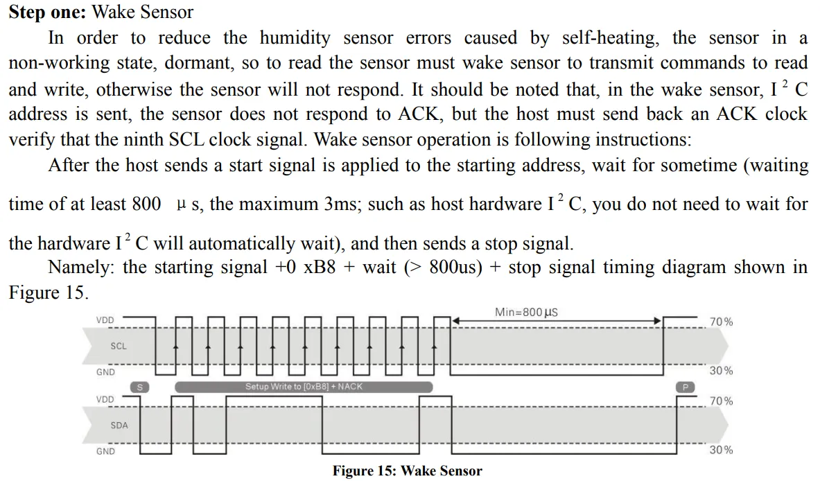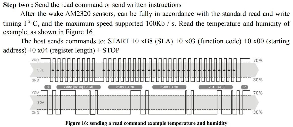 AM2320 센서는 기본적으로 절전 모드를 유지합니다. 따라서 센서를 읽기 전, 센서를 깨워줘야 하는데요, 이를 위해 쓰기 요청을 전송해야 합니다.