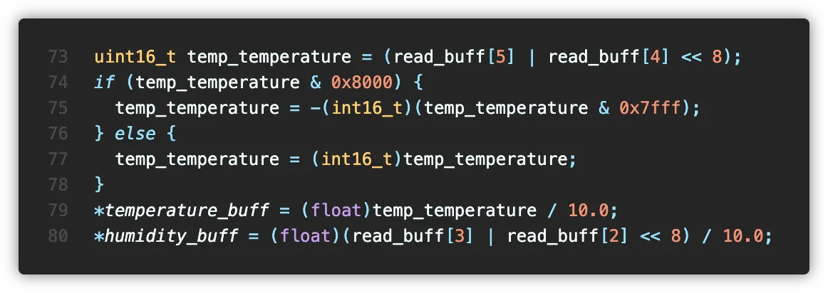 반으로 갈라진 온도, 습도 데이터를 비트 연산해 float 타입으로 이어붙여 함수 호출 과정에서 입력받는 데이터 버퍼에 넣어주도록 했습니다.