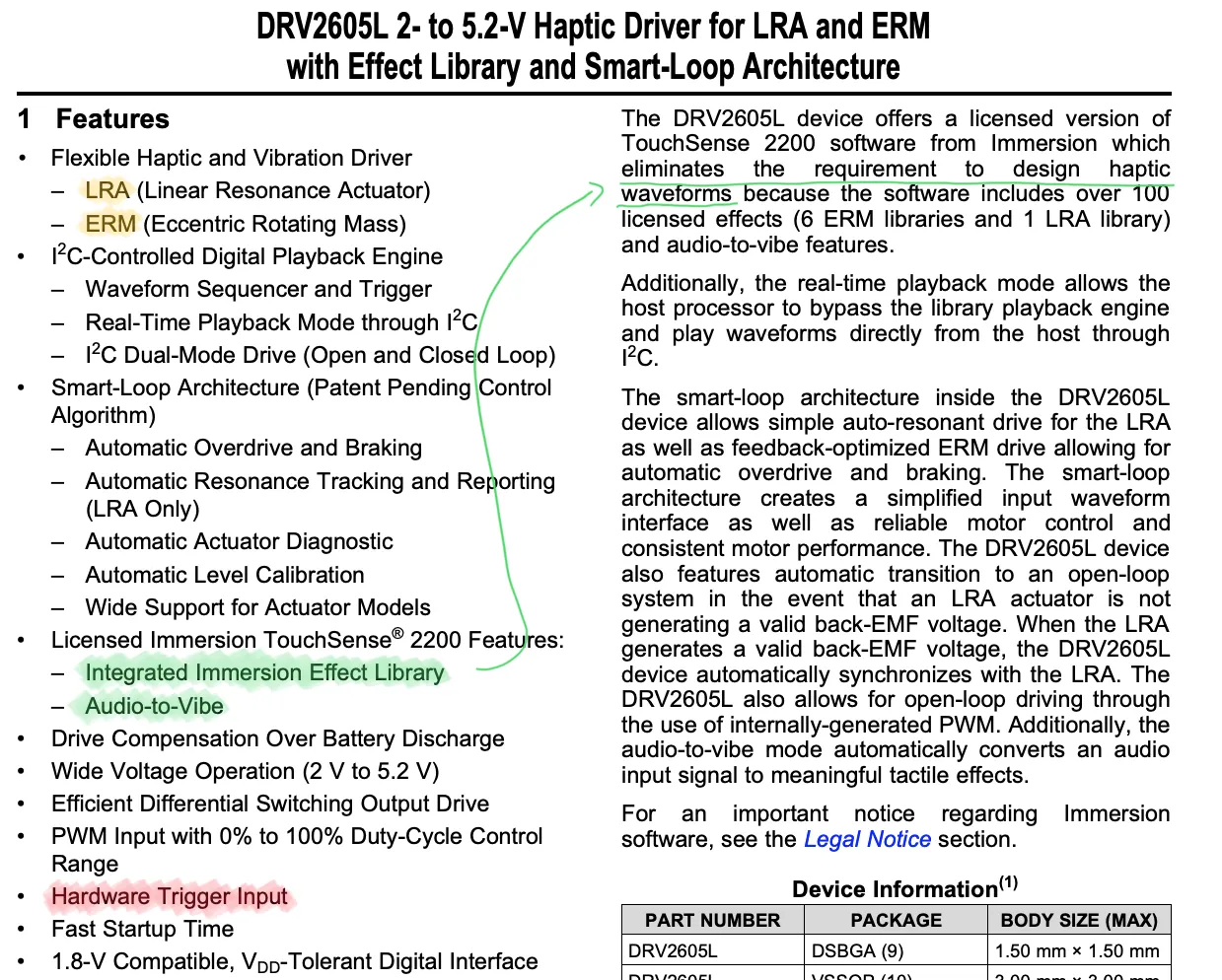 immersion의 TouchSense 2200 라이브러리가 내장되어 있어 123가지의 미리 정의된 햅틱을 쉽게 활용할 수 있습니다. (IC에 라이센스 포함됨) Audio-toVibe 기능을 활용하면 IC의 Input 핀을 통해 오디오를 입력받아 진동으로 재생할 수 있다고 하네요. 언젠가 시간이 되면 테스트해서 추가해보겠습니다.