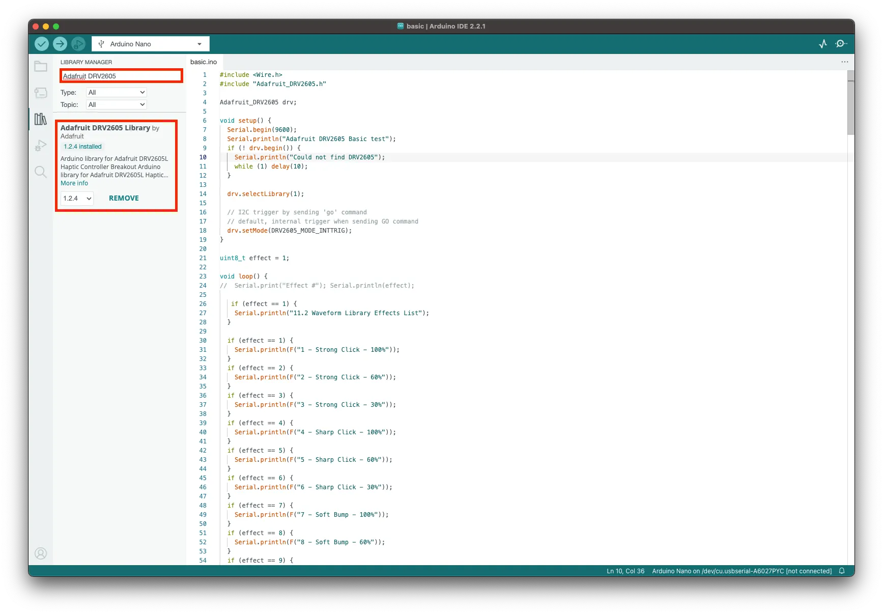 라이브러리 매니저에서 “Adafruit DRV2605”를 검색해 라이브러리를 설치해주세요.