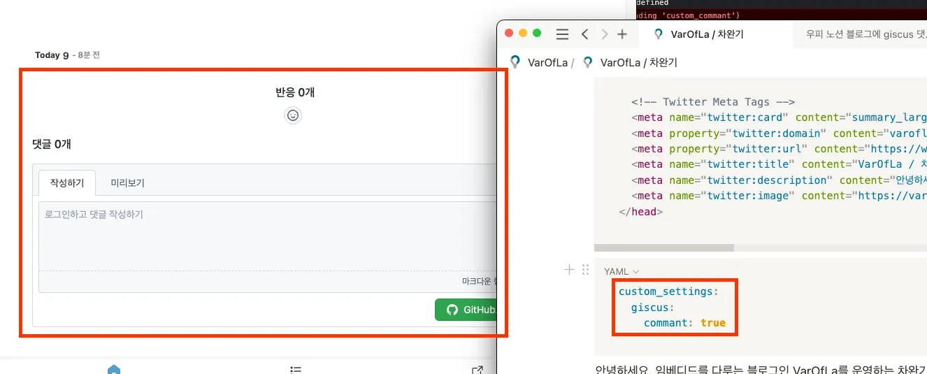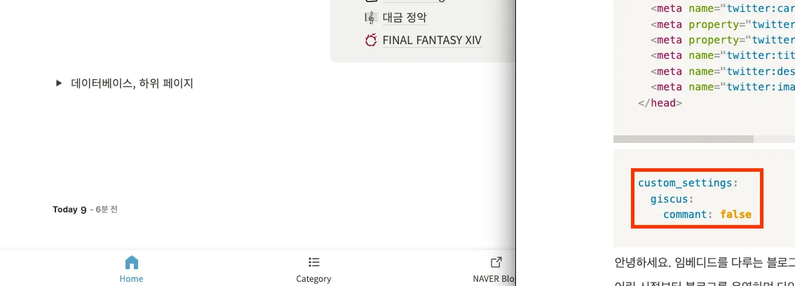 그러면 대략 위와 같이 코드를 작성하면 될것같은데요, 문제는 custom_settings, giscus, comment 중 하나라도 없으면 undefined 오류가 발생해 키를 일일이 체크해줘야 한다는 것이었습니다.