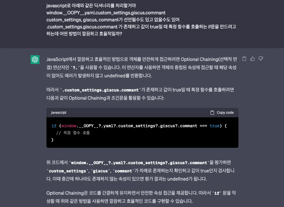 선택적 연결 연산자....? 예전에 백엔드 만들어보겠다고 삽질할때도 느꼈지만 JavaScript에는 별 희한한게 다 있는것 같습니다 ㅋㅋㅋ
