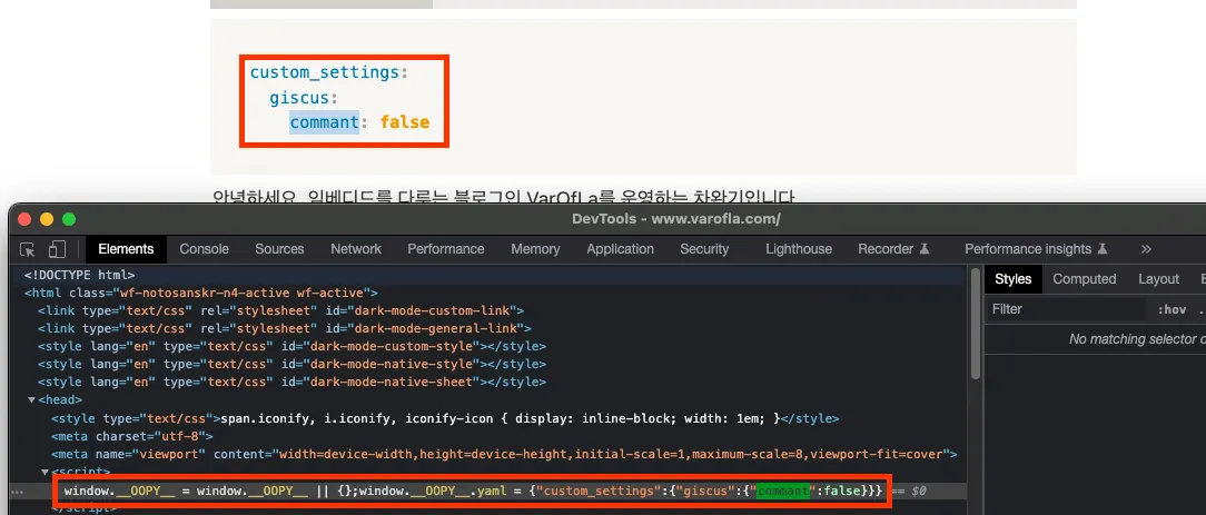 따라서 위 사진처럼 yaml 코드를 입력하면 __OOPY__.yaml.custom_settings.giscus.comment가 false로 저장되는것을 확인할 수 있었습니다.