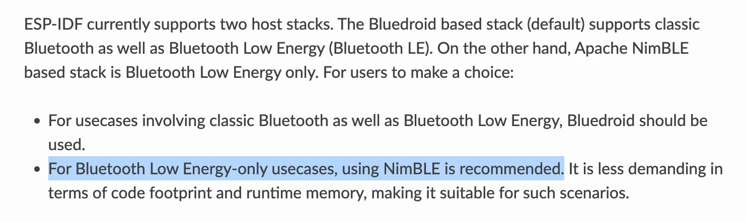 ESP-IDF는 BLE 스택으로 Classic과 LE 모두 지원하는 Bluedroid와 LE만을 지원하는 NimBLE 두 가지 선택지를 제공합니다. 이번 프로젝트에서는 BLE만을 사용하기 때문에 공식 Docs의 권장사항대로 NimBLE을 사용하기로 하였습니다.
