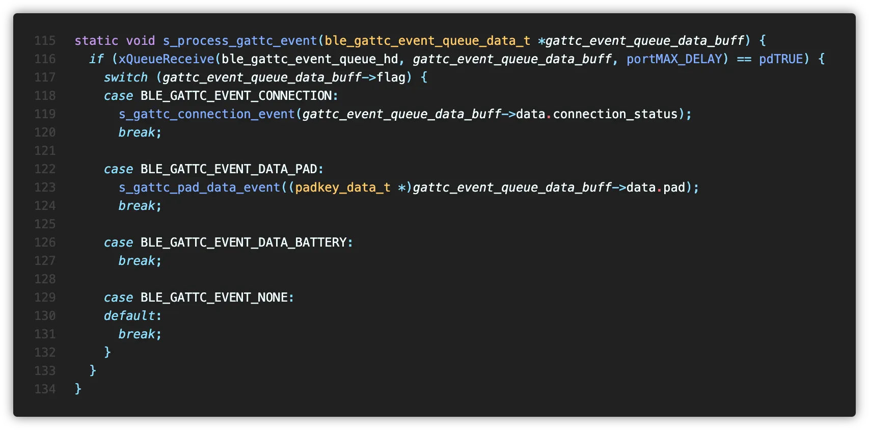 s_process_gattc_event() 함수의 내용을 보면 ble_gattc_event_queue_hd 큐를 계속 기다리는데요, 이벤트가 들어오면 flag에 따라 함수를 실행합니다.