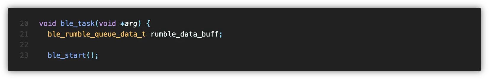 한편 Rumble은 ble_rumble_queue_hd 이름의 큐(핸들러)를 감시하며, 데이터가 입력되는 경우 ble.c의 Rumble 전송 함수(ble_send_rumble())를 호출해 동작합니다.