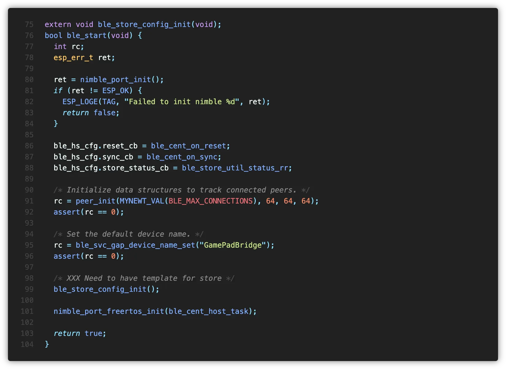 BLE Task에서 ble_start() 함수를 호출하면 Bluetooth와 NimBLE이 init됩니다. 예제의 init 순서를 그대로 가져왔습니다.