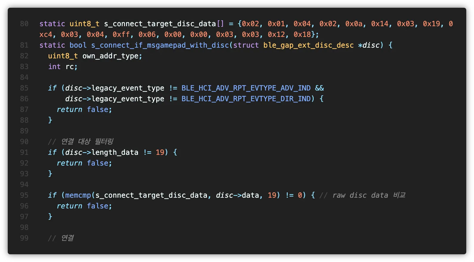 init이 완료되면 scan을 시작하고, 사전에 기록해둔 게임패드의 Discovery Packet을 RAW로 비교하여 게임패드에 해당하는 장치만 연결을 시도합니다.