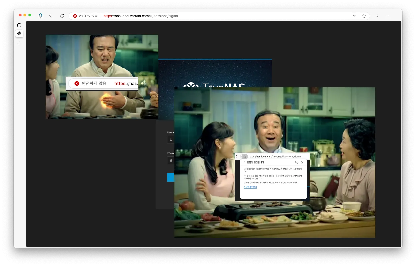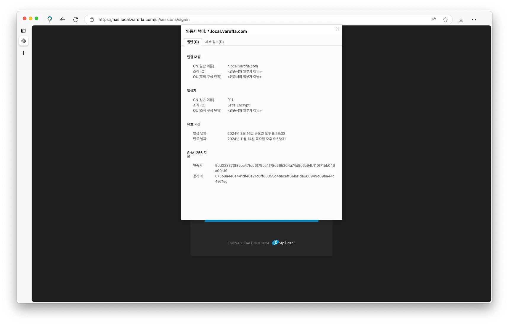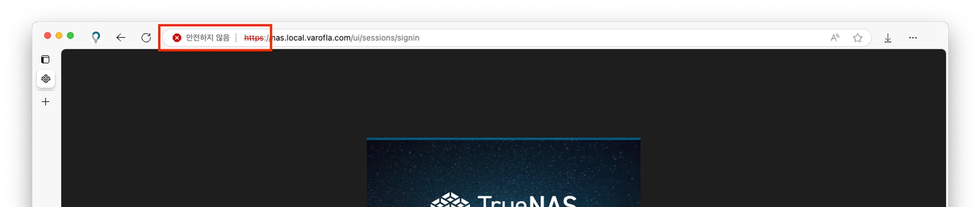 테스트를 위해 TrueNAS의 Web UI에 접속했습니다. 인증서가 잘 먹는게 보이죠.