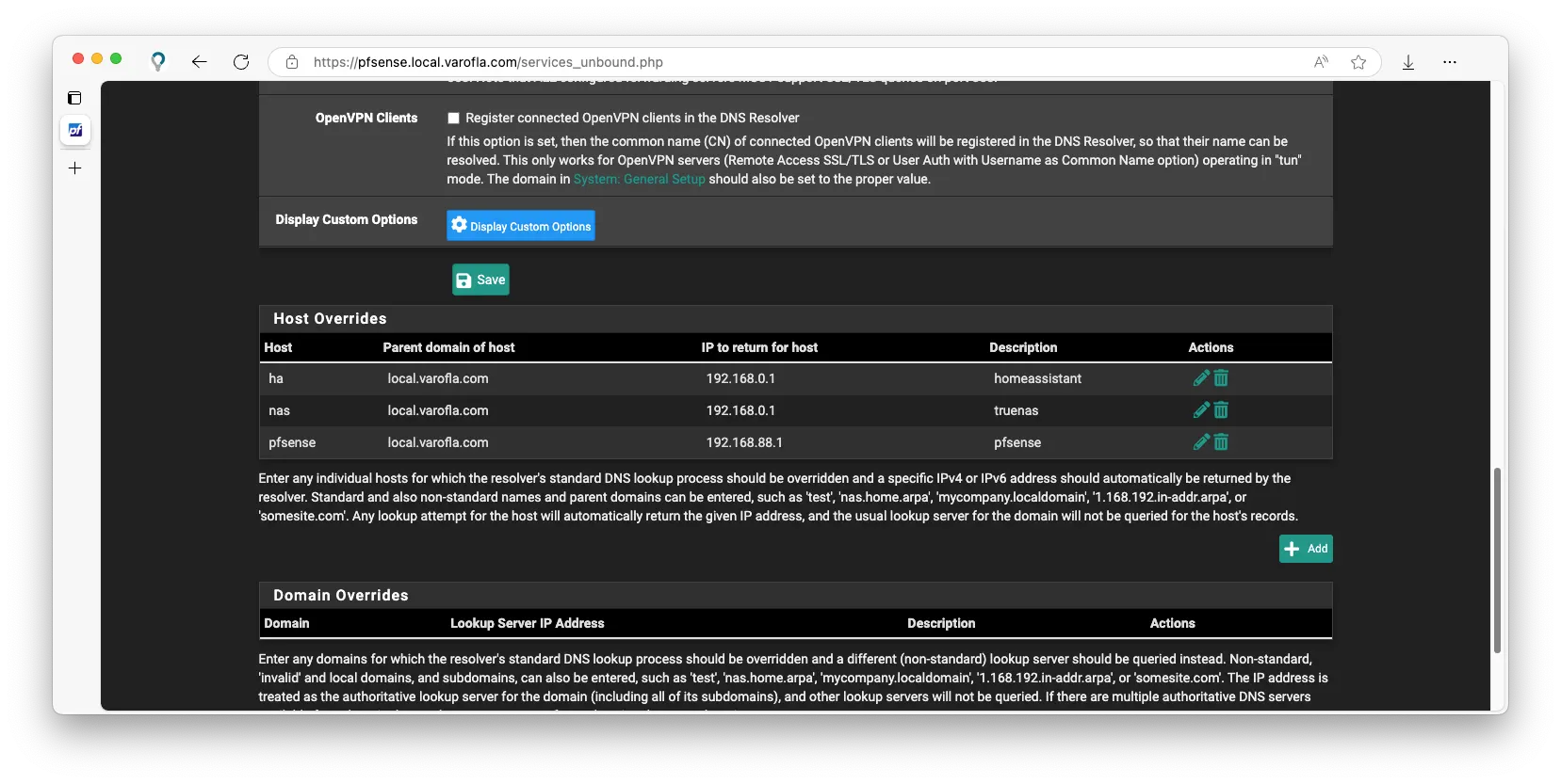 pfSense는 사설 DNS 서버를 포함하고 있어, DNS Resolver를 사용하면 내부망을 URL로 깔끔하게 정리할 수 있습니다. 보통 홈랩에서는 .home.arpa를 사용하는 편이지만, 제가 참고했던 자료에서는 어떤어떤(?) 이유로 개인 도매인을 권장해, 앞에 local을 붙인 .local.varofla.com을 사용하게 되었습니다.