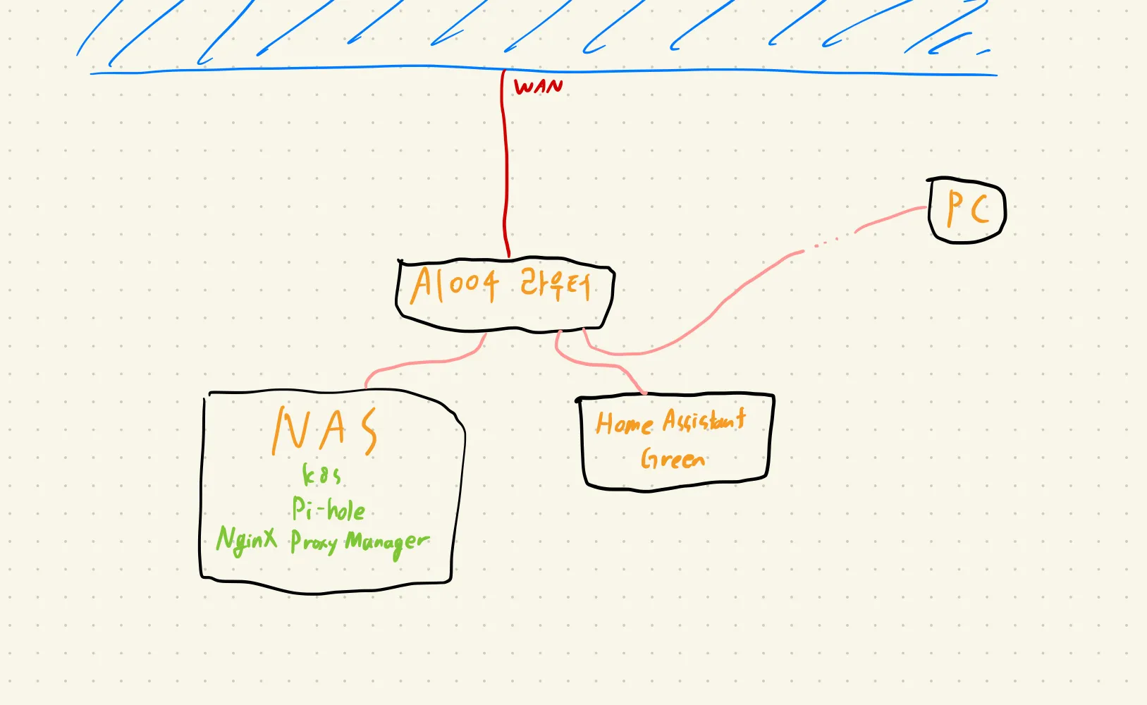 언제 샀는지 기억조차 나지 않는 ipTIME A1004 공유기를 통해 사설망이 구성되고, 사설망에는 Home Assistant Green, NAS, NAS 속의 K8s컨테이너에 있는 Pi-hole, Nginx Proxy Manager(NPM) 등이 구성되어 있습니다.