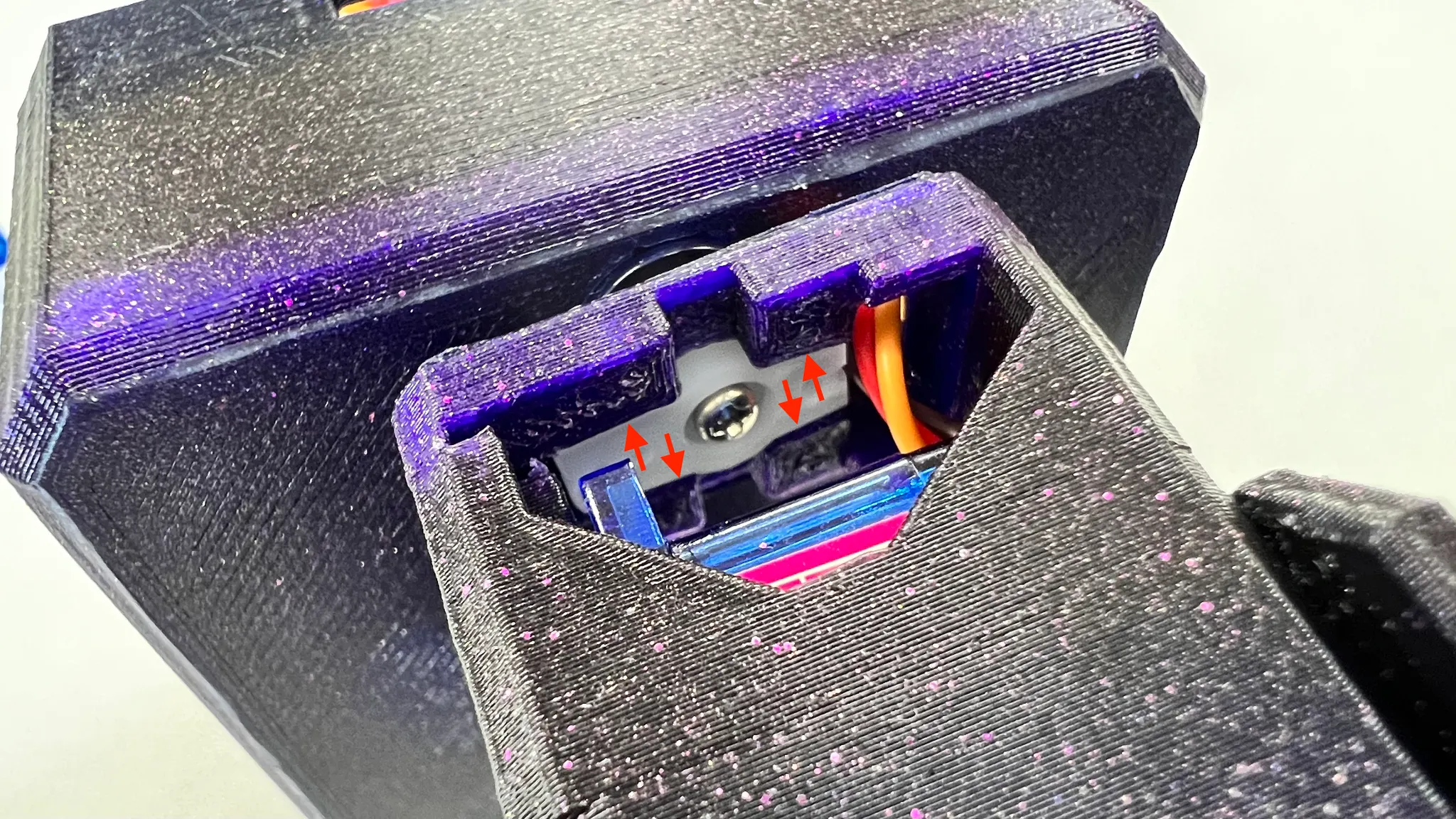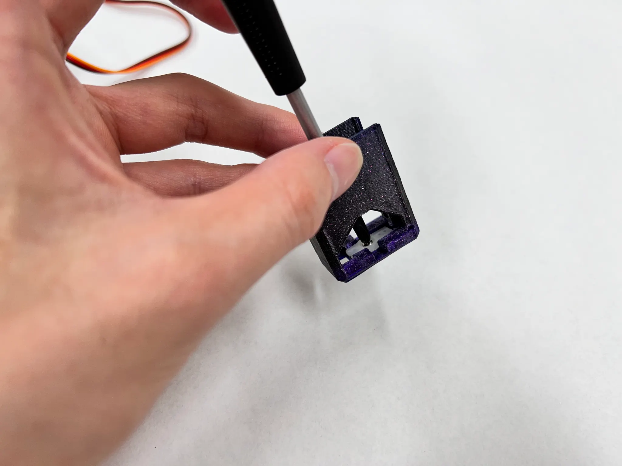 케이블을 통과시켜준 후 모터를 결합합니다. 이때 모터 방향에 유의합니다. 모터에서 케이블이 나오는 부분이 사진을 기준으로 윗쪽으로 향하고, 케이블은 모터의 뒷쪽을 감싸는 방향입니다.