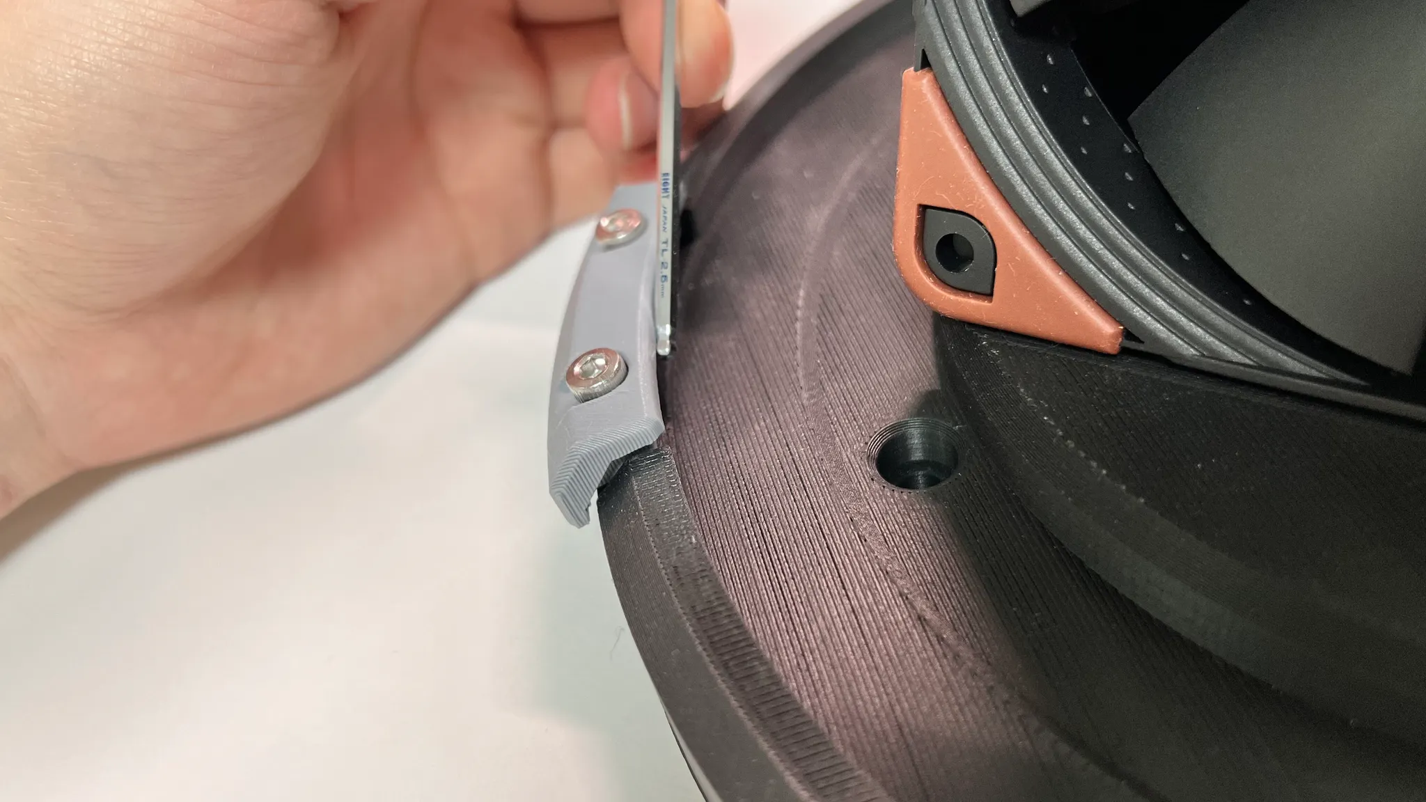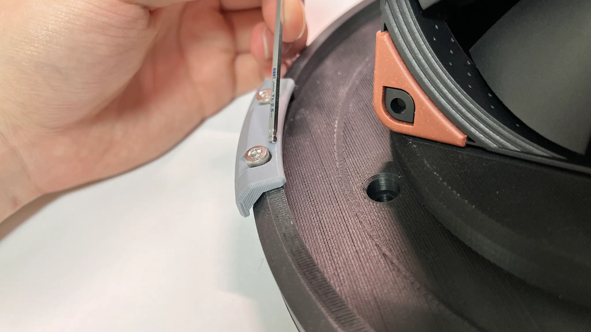 검은색의 볼트가 조여지면 파란색의 Jaw가 초록색의 몸체 쪽으로 움직이며 회색 필터가 밀착되는 구조입니다. Jaw의 볼트 홀을 크게 뚫으면 Jaw가 틸트되어서 나사를 풀었을 때 필터를 분리할 수 있겠죠.
