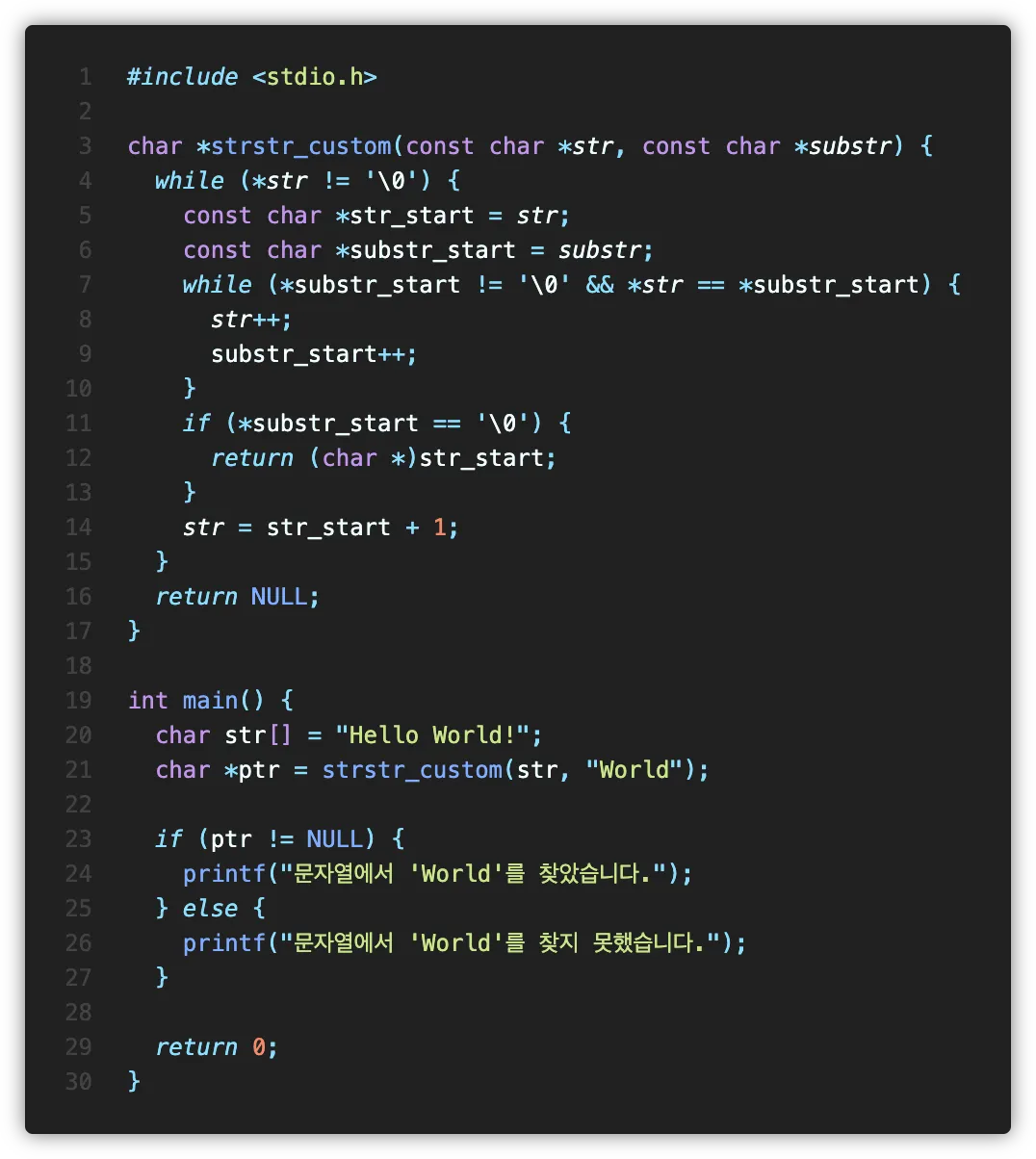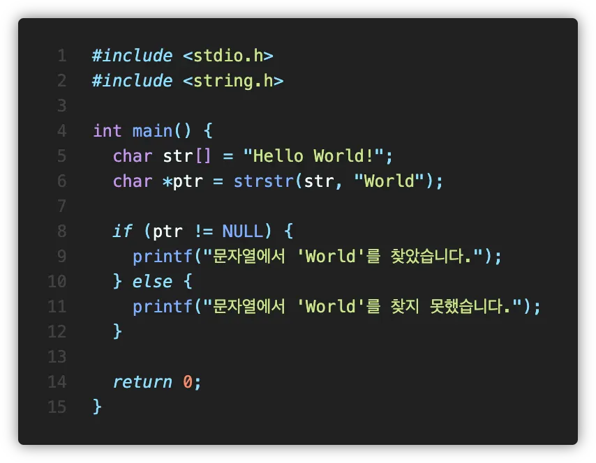 반환값 : 문자열에서 찾은 문자열의 포인터. 없다면 NULL 반환