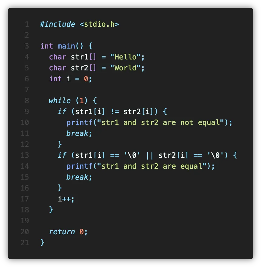 C언어에서는 모든 문자열의 마지막에 문자열을 끝을 알리는 NULL문자(\0)가 있음을 이용해 두 문자열 중 하나가 끝날 때 까지 문자열을 반복적으로 비교합니다.