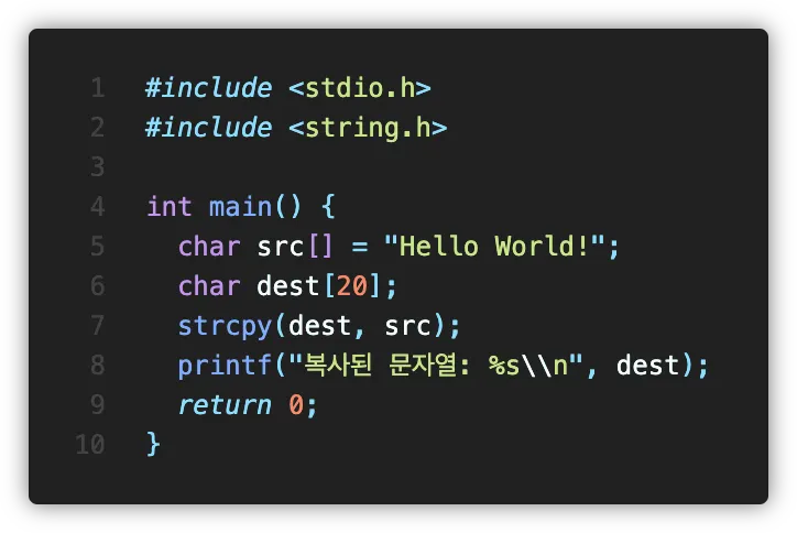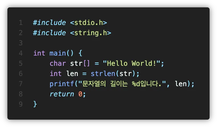 문자열을 비교하는 위 예제 이외에도 문자열의 모든 연산에 반복문을 사용해야 하기 때문에 코드가 복잡해지게 됩니다. 이를 간단하게 해결하기 위한 문자열 연산 라이브러리 string.h의 주요 함수를 알아보도록 하겠습니다.