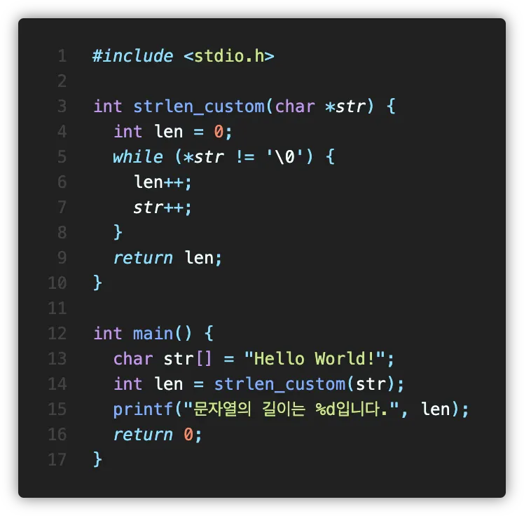 모든 문자열이 null-terminated라면 반복문을 이용해 NULL 문자가 존재할 때 까지 숫자를 더하면 NULL 문자를 포함한 문자열의 길이를 알아낼 수 있습니다.