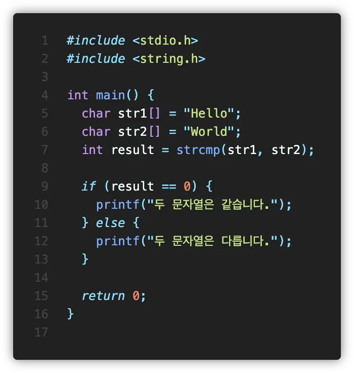 반면에 C언어에서는 문자열이 배열로 구현되어 문자열끼리 비교하기 위해서는 반복문을 만들어 직접 문자열의 내용 하나하나를 비교하여야 합니다.