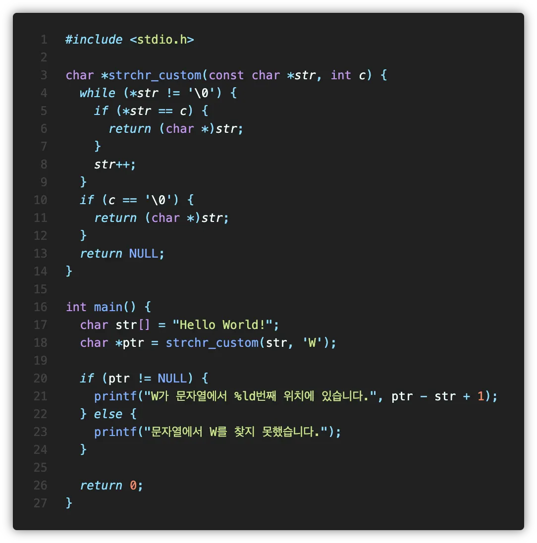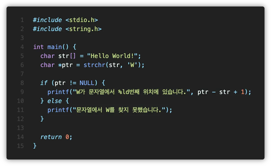반환값 : 문자열에서 찾은 문자의 포인터. 없다면 NULL 반환