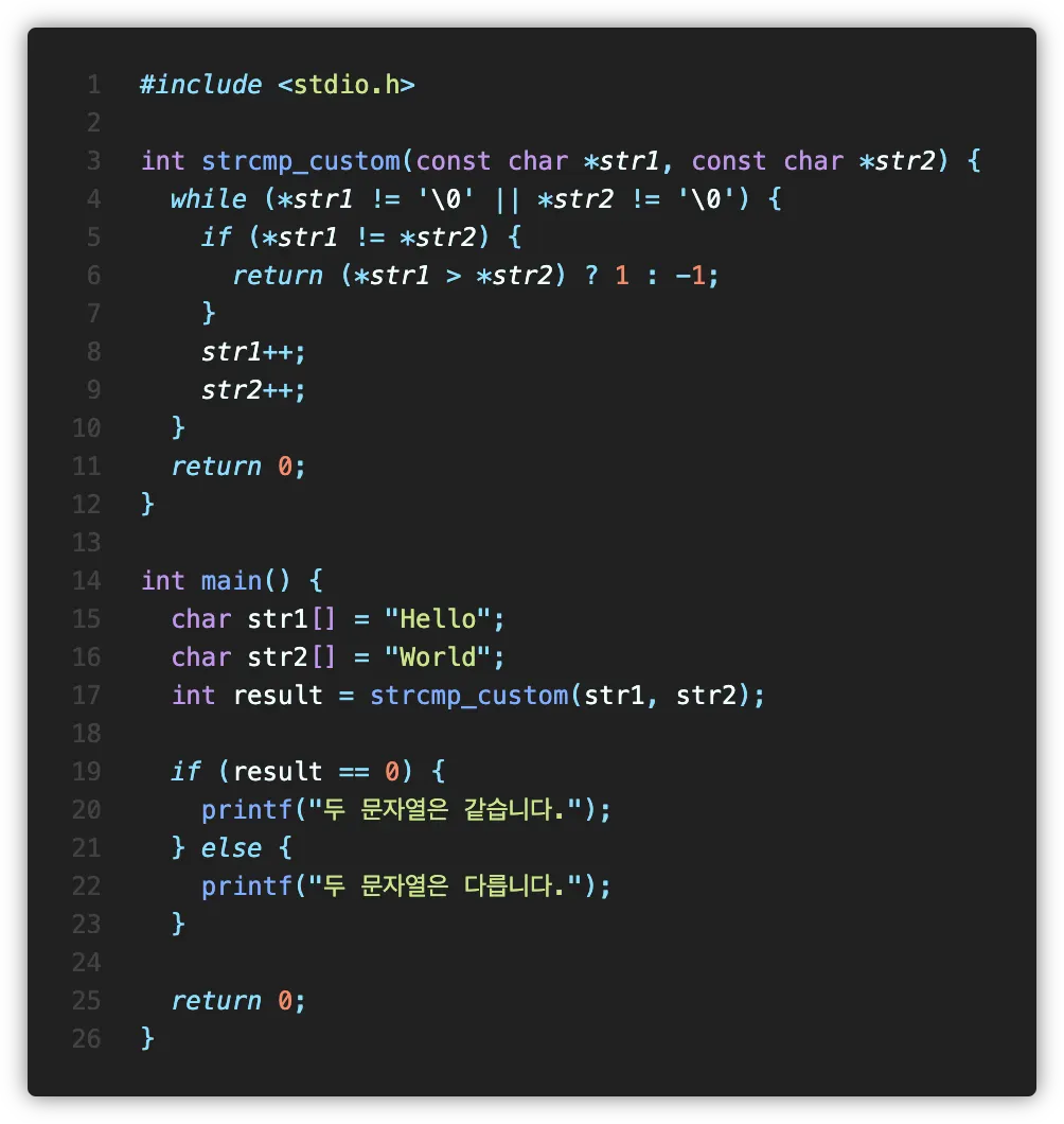 이때 하나라도 값이 다르다면 문자열이 다른 것으로 판단하고, NULL문자를 만날 때 까지 다른 점을 찾지 못한다면 문자열이 같은 것으로 판단합니다.