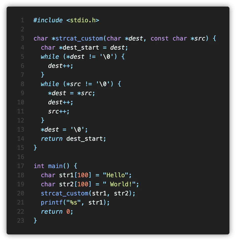 문자열을 이어붙일때에는 우선 이어붙일 대상의 마지막 지점을 NULL문자을 이용해 찾고 그 뒤에 이어붙이는 문자를 NULL문자가 나올 때 까지 복사하는 과정을 거칩니다.