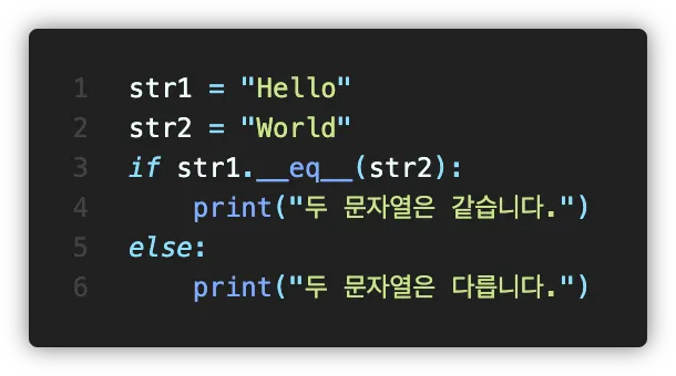 C언어와 가장 많이 비교되는 파이썬은 모든 자료형이 객체(Objetc)로 구현되기 때문에 연산을 객체 내부의 메소드를 이용해 진행합니다. 예를 들어 문자열을 비교할 때 표면적으로는 is 라는 비교 연산자를 사용하지만 내부적으로는 str Class에 구현된 __eq__() 메소드가 작동하게 됩니다.