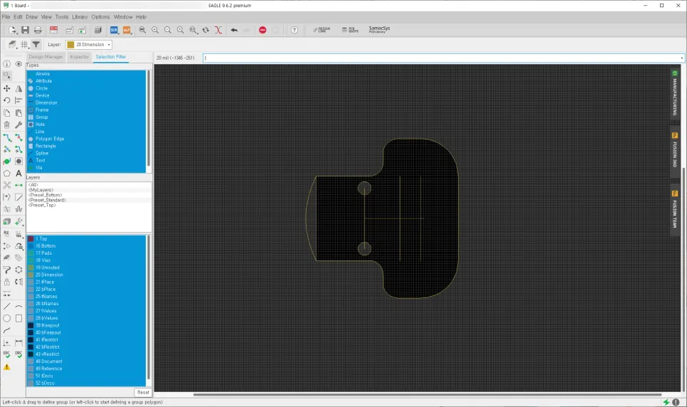 DXF로 저장한 후 이글에서 불러오면 이렇게 됩니다. 일단 여기까지 진행하고 Schematic으로 넘어갔습니다.