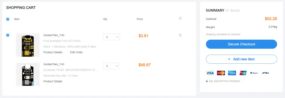 당연하게도 JLCPCB에서는 0.4~2.0까지 다양한 두께의 PCB를 지원하고 있습니다. 두께의 오차가 (-10~+10)%인 점을 고려했을 때 1mm PCB로 선택하는 게 좋을 것 같습니다. 마침 Economic PCBA에서 1mm 두께까지만 검은색 솔더마스크를 지원하네요!