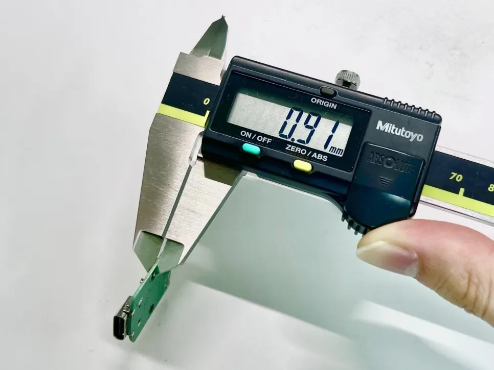 무드등을 분해하고 PCB를 끄집어냈을 때 유난히 얇아 보였는데요, 실제로 측정해 보니 0.9mm였습니다. 일반적인 PCB의 두께인 1.6mm보다 대충 2배 정도 얇았습니다.