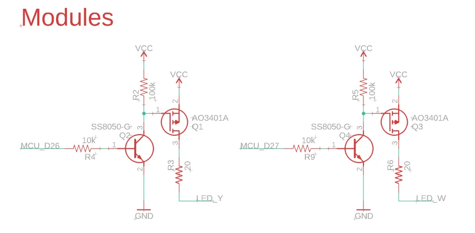 한편, IC의 5, 6번 핀에는 트랜지스터의 베이스가 각각 10k 저항을 통해 연결되어 있습니다. 그리고 트랜지스터는 모스펫의 게이트에 연결되어 있네요. P 채널 모스펫을 사용해 GND가 묶인 두 LED를 High-side Switching 하는 것 같습니다. 딱히 두 LED의 작동 전압이 다르지 않아 보이는데 굳이 이렇게 설계한 이유는 모르겠습니다.