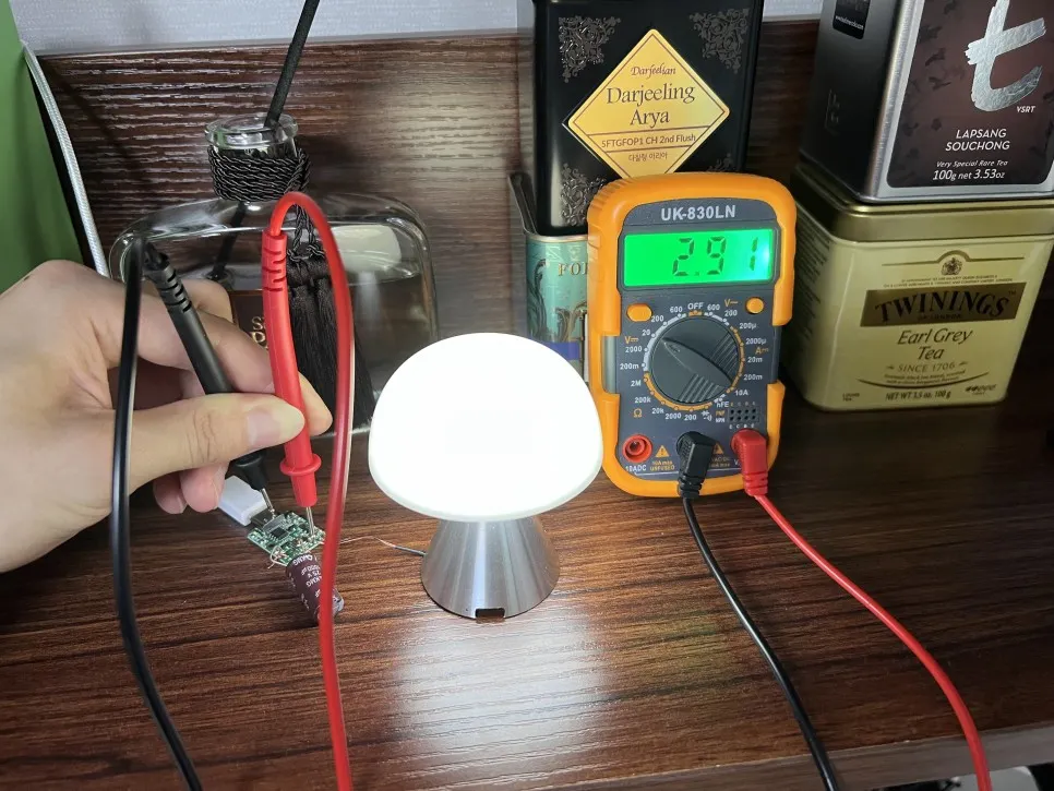 다음으로 LED의 작동 전압을 측정했습니다. 실제 출력전압은 2.9V, 파워서플라이로 테스트해 보니 3.2V 정도가 적당할 것 같습니다. LED가 200mA나 먹는데다가 MCU 소비전류까지 생각하면 배터리로는 절대로 안되겠죠. 충전식은 포기하고 USB 상시전원을 고려해야겠습니다.