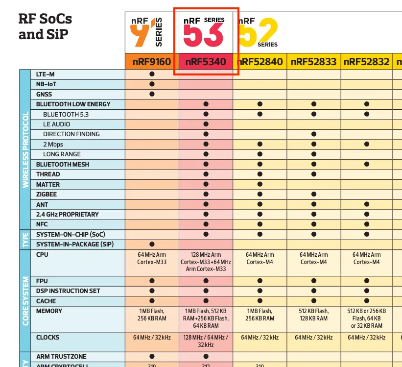 nRF52840의 상위호환격인 nRF5340이 들어있습니다. 52840 대비 몇몇 무선 프로토콜이 추가되고 높은 성능과 듀얼 코어를 가진 SoC이죠. 뭔가 손해보는 느낌